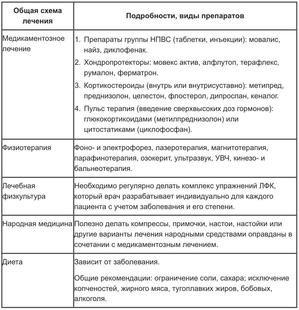 А, собственно, какие варианты есть? Давайте, я перечислю их по порядку, по мере удаления от принятых на сегодня в медицинских учреждениях. То есть, начну с так называемых «официальных», то есть тех, которым нас врачей обучали и обучают сегодня по утверждённым учебным программам, и по порядку, по мере убывания «официальности», до тех, к которым люди начинают прибегать от неэффективности предыдущих, например мазать суставы настойкой «золотого уса», хрена, или чеснока на тройном одеколоне, лошадиным гелем и затем обматывать капустным листом.
